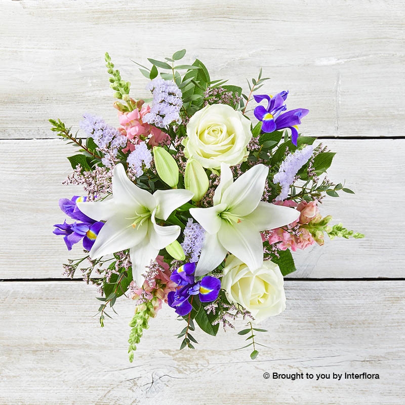 A stunning vase arrangement of elegant blooms to brighten someone’s day. Our Luscious Lily Vase is expertly created by our florists using carefully sourced flowers which include pink antirrhinum, blue iris, white lily, pink Limonium, ivory roses and lilac statice. We add salal tips and eucalyptus for texture and volume, and arrange in a stylish lilac vase.