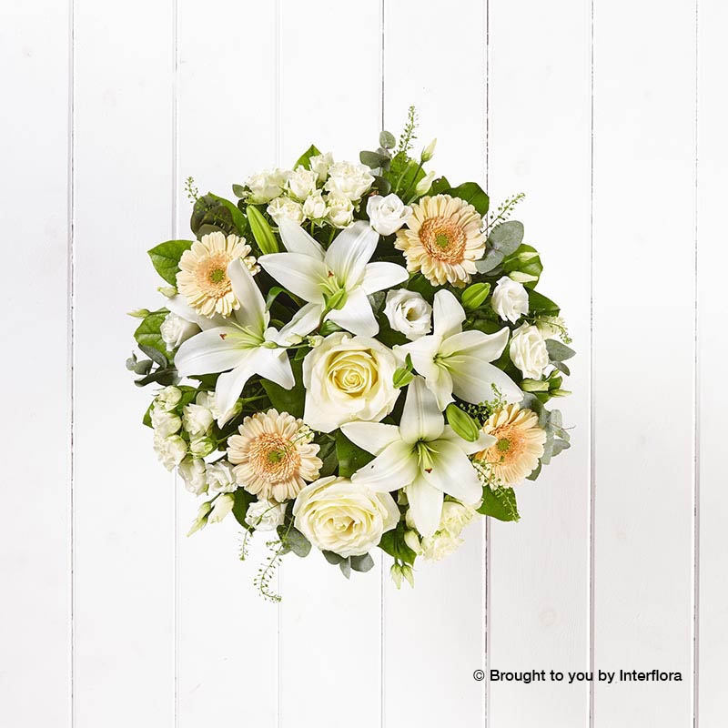 Mellow Meringue Hand-tied features ivory large headed roses, white LA lilies, white lisianthus, white spray roses, cream germini and thlaspi, hand-tied with salal and eucalyptus. Our florists wrap the flowers in kraft paper and tie with ribbon, and Mellow Meringue Hand-tied is presented in a Gift Box. Flowers may be changed subjet to availabilty