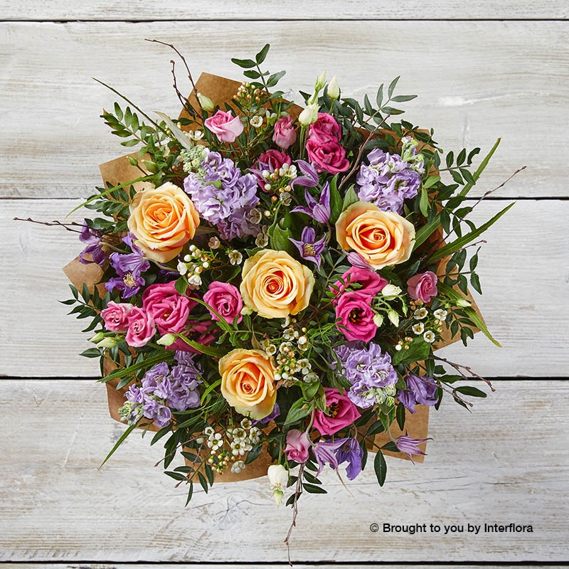 Our flower team use some of our most popular Spring flowers to create Tutti Frutti Hand-tied, including peach roses, lilac stocks, purple clematis, pink lisianthus and white wax flower. For a lovely full texture look we add pistache, natural birch and grevillea before wrapping in kraft paper and tie with ribbon.